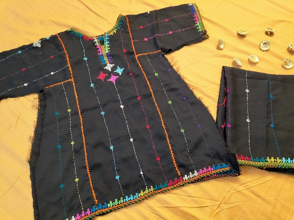 Balochi Kids Kurti Design there is something about halter necks that is so desirable, wouldn’t you agree? We are head over heels in love with our ‘Balochi Kids Kurti’ dress that is oh-so-Fabulous! Feel the handcrafted love in this pure cotton dress that has a gorgeous Balochi hand work along the front side, back side , and shalwar.