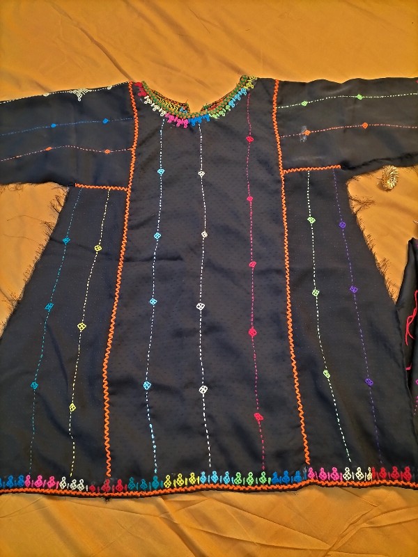 Hand Embroidered in rainbow colors, the semi-circle design will bring extra sparkle to your little one this eid. Breathable ans soft fabric perfect for this eid. Always say yes to extra sparkle! The hemline is lined with beactiful stitch in different colors and two dori at neck to fasten the neck. This flirty frock-dress comes with soft fabric you can dance away carefree at the home or any event!